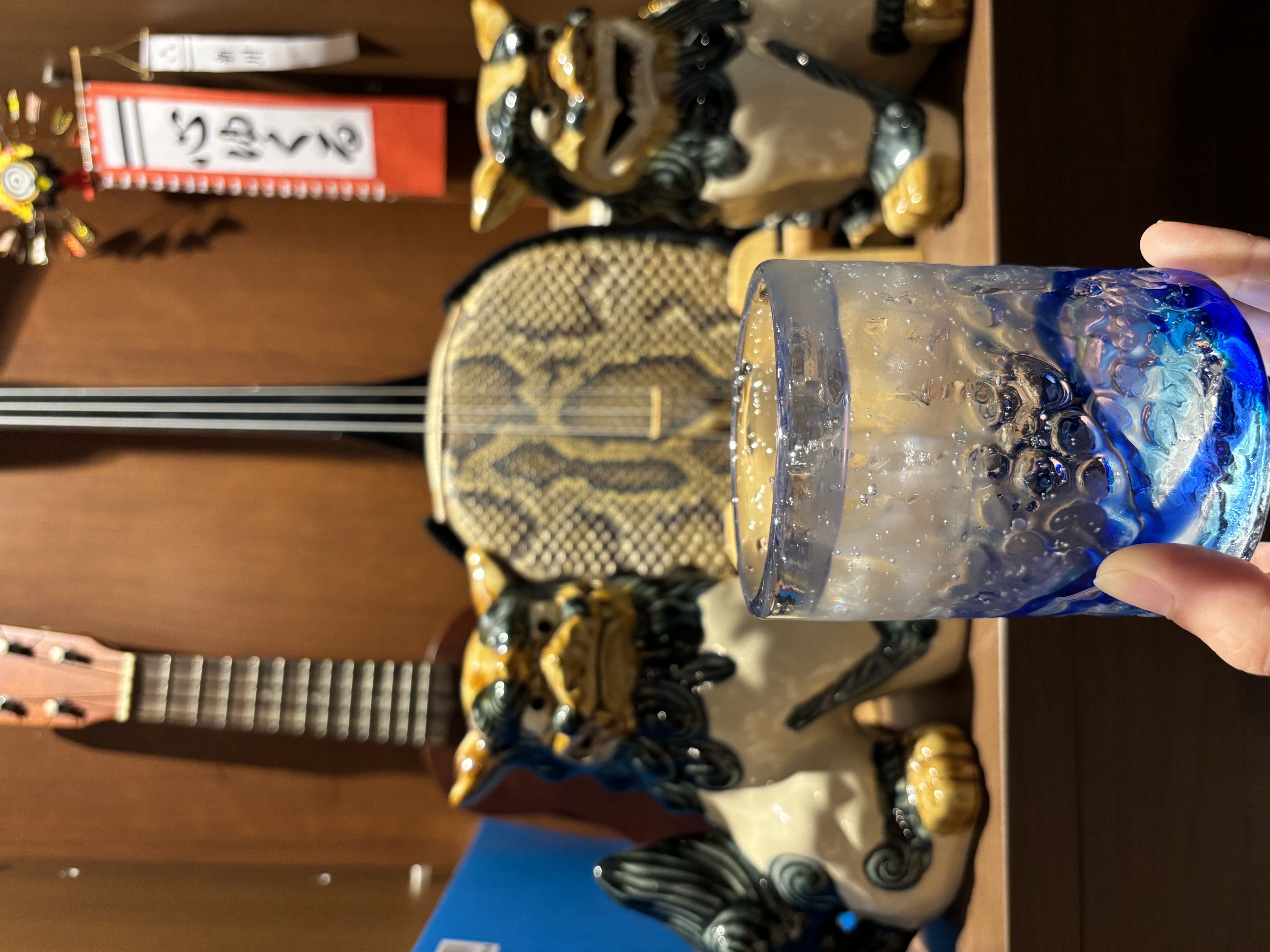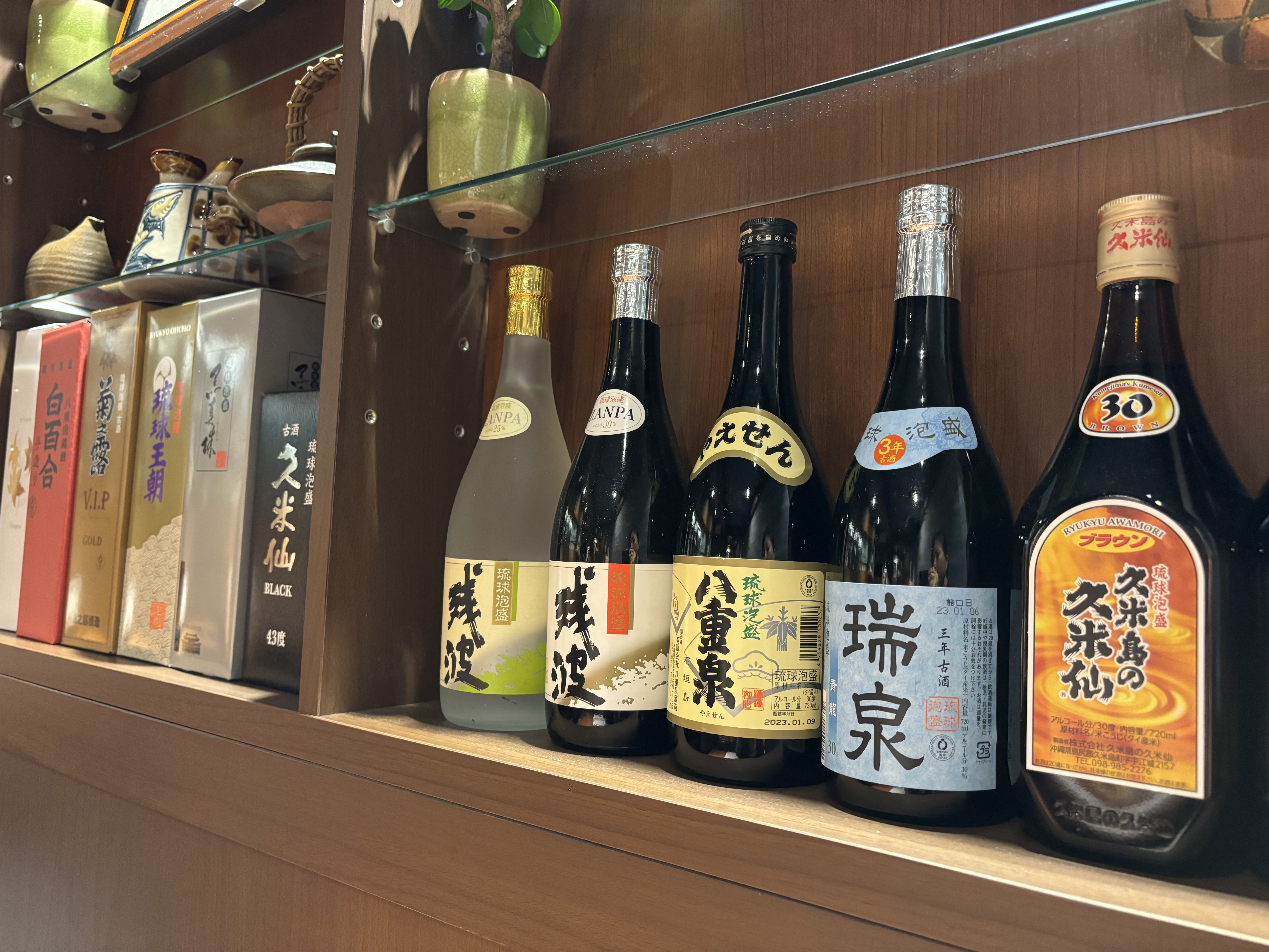 たくさんの琉球泡盛や三線(さんしん:沖縄の弦楽器)も置かれており実際に弾かせていただきました!