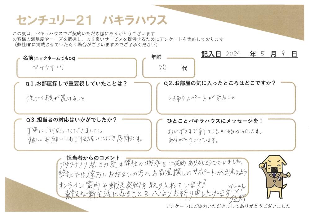 【居住用賃貸ご成約】アサクサノリ様・20代