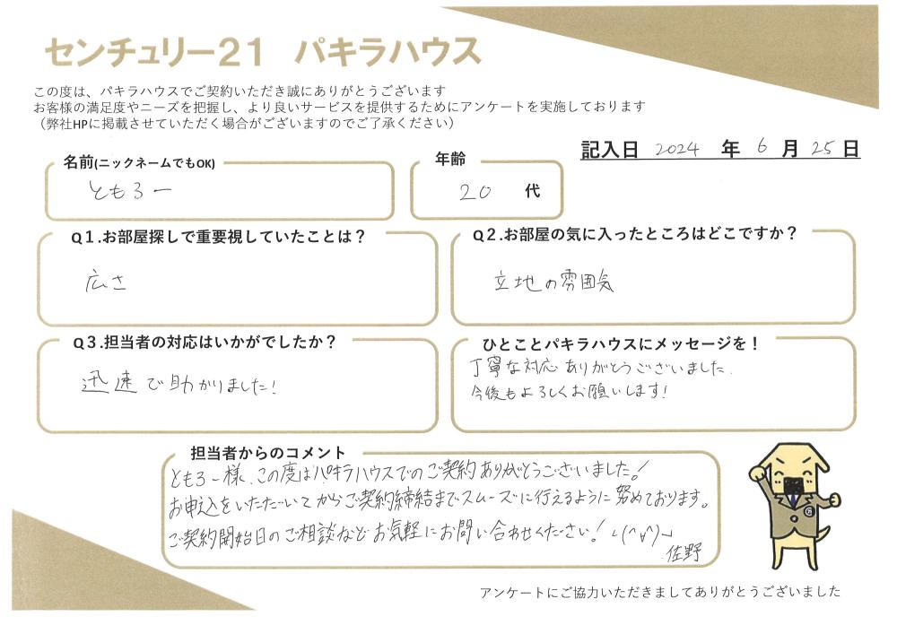 ともろー様。 この度はパキラハウスでのご契約ありがとうございました!お申込みをいただいてからご契約締結までスムーズに行えるように努めております。ご契約開始日のご相談などお気軽にお問い合わせください!└(^∀^)┘ 佐野
