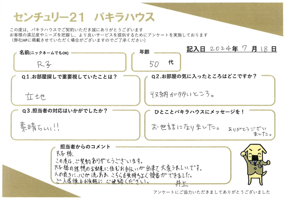 R子様 この度は、ご契約ありがとうございます。R子様の理想のお部屋に住むお手伝いが出来て大変うれしいです。人の良さに、心が洗われこちらも気持ちよく接客ができました。ご入居後もお気軽にご連絡ください。 井上