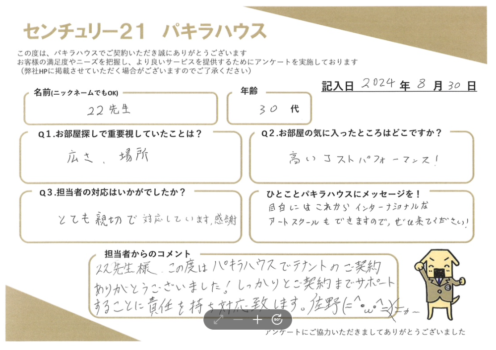 お客様の声【事業用賃貸ご成約】22先生様・30代 | 雑司が谷・目白の賃貸・不動産ならセンチュリー21パキラハウス