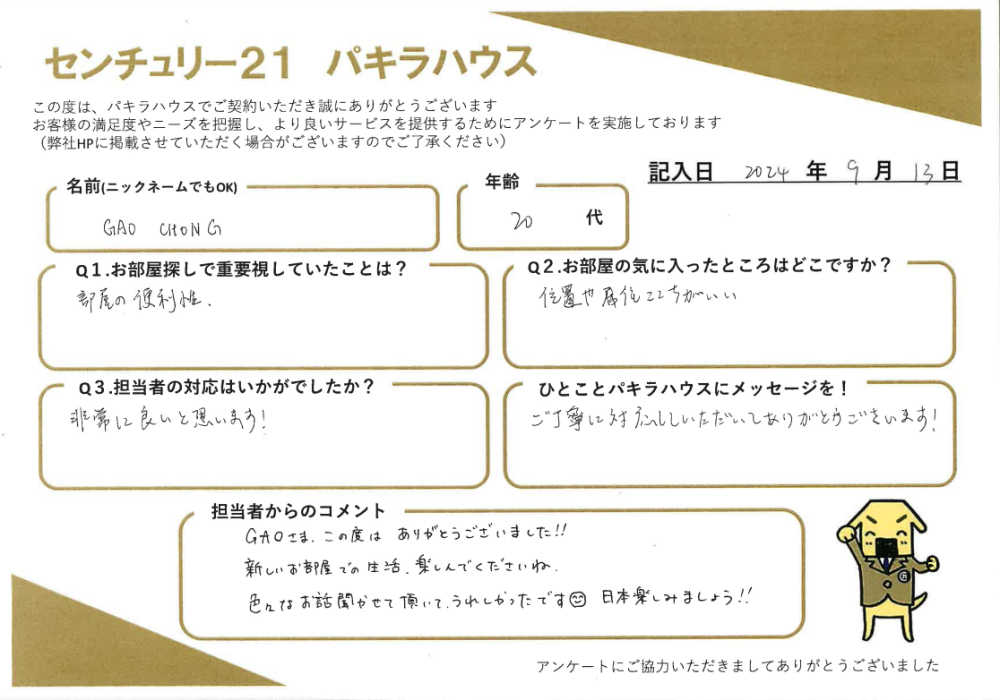 お客様の声【居住用賃貸ご成約】GAO CHONG様・20代 | 雑司が谷・目白の賃貸・不動産ならセンチュリー21パキラハウス