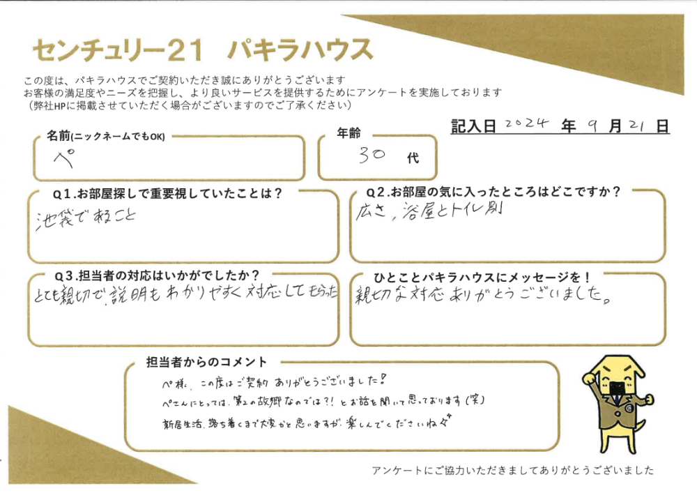 お客様の声【居住用賃貸ご成約】ぺ様・30代 | 雑司が谷・目白の賃貸・不動産ならセンチュリー21パキラハウス