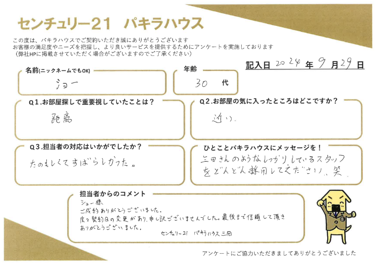 【居住用賃貸ご成約】ショー様・30代