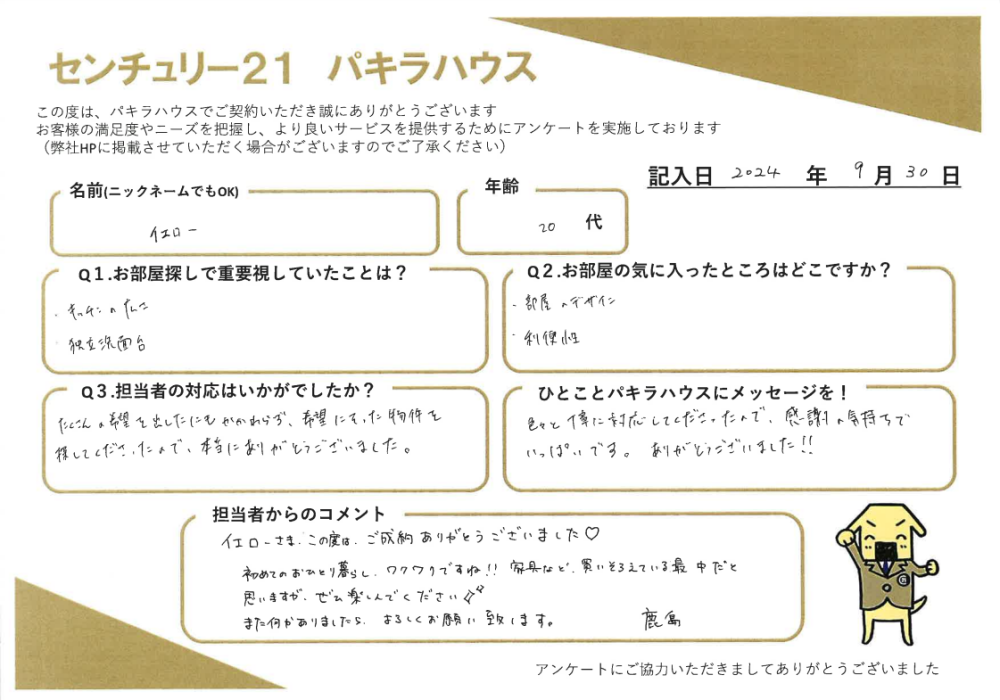 たくさんの希望を出したにもかかわらず、希望にそった物件を探してくださったので、本当にありがとうございました。
