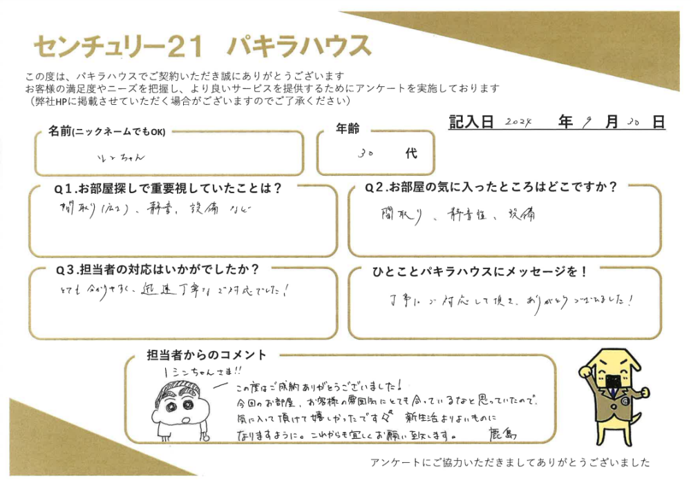 シンちゃんさま この度はご成約ありがとうございました!今回のお部屋、お客様の雰囲気にとても合っているなと思ったので、気に入って頂けて嬉しかったです✧︎*。新生活よりよいものになりますように。これからも宜しくお願い致します。鹿島
