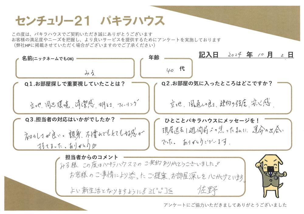 【居住用賃貸ご成約】みる様・40代