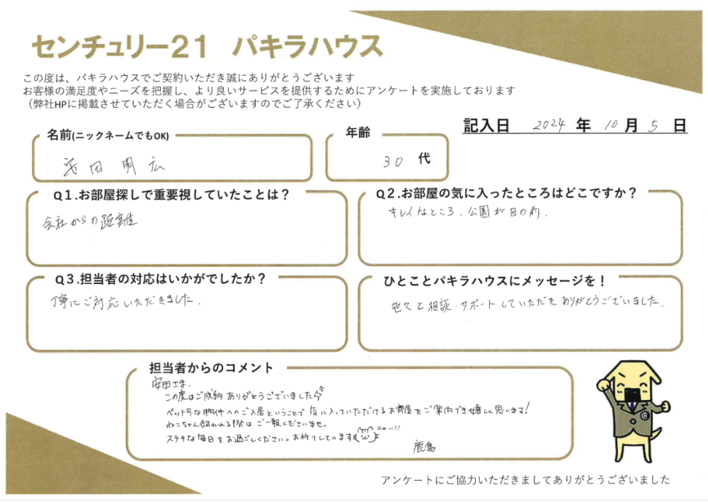 安田さま この度はご成約ありがとうございました✦.*·̩ ペット可な物件へのご入居ということで、気に入っていただけるお部屋をご案内でき嬉しく思います! ねこちゃん飼われる際はご一報くださいませ。 素敵な毎日をお過ごしください。お祈りしています(=^・ω・^=)ニャー‼ 鹿島