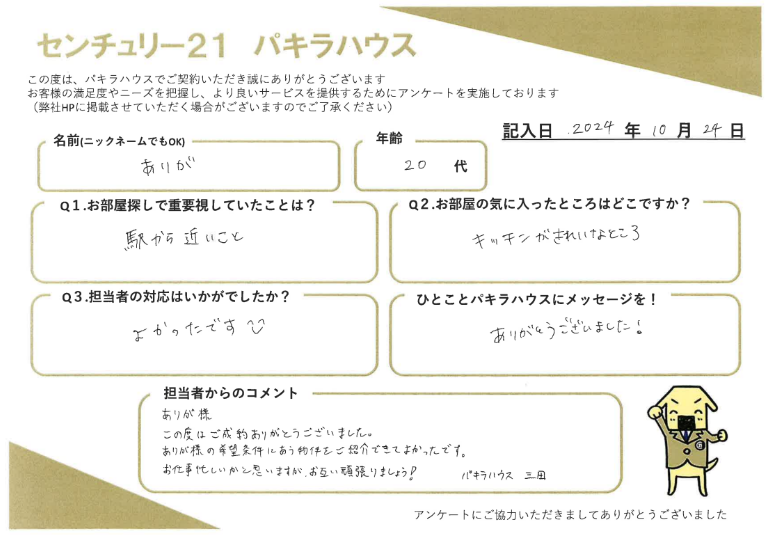 お客様の声【居住用賃貸ご成約】ありが様・20代 | 雑司が谷・目白の賃貸・不動産ならセンチュリー21パキラハウス