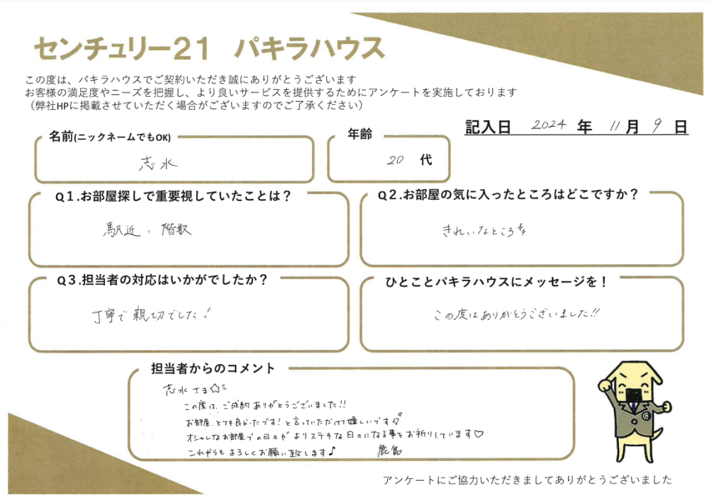 この度はご成約ありがとうございました!!お部屋とても良かったです!と言っていただけて嬉しいです✧*オシャレなお部屋での日々がより素敵な日々になる事をお祈りしています♡これからもよろしくお願い致します♪