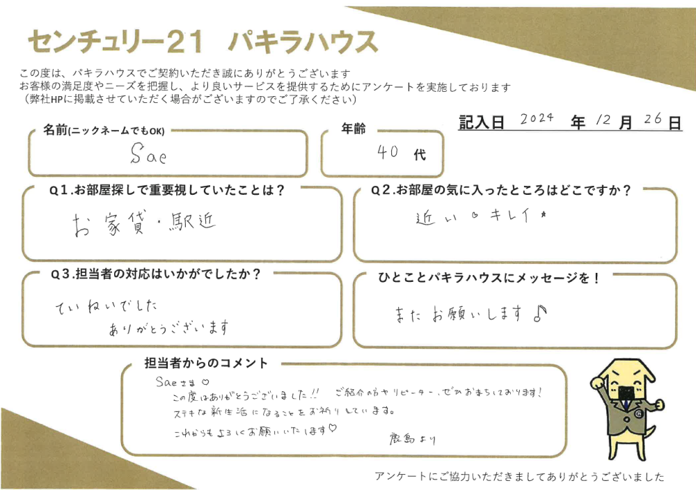 お客様の声【居住用賃貸ご成約】Sae様・40代 | 雑司が谷・目白の賃貸・不動産ならセンチュリー21パキラハウス