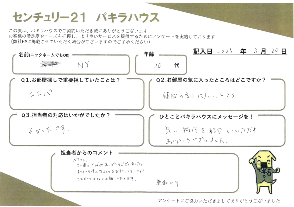 お客様の声【居住用賃貸ご成約】NY様・20代 | 雑司が谷・目白の賃貸・不動産ならセンチュリー21パキラハウス