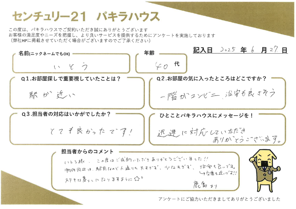 お客様の声【居住用賃貸ご成約】いとう様・40代 | 雑司が谷・目白の賃貸・不動産ならセンチュリー21パキラハウス