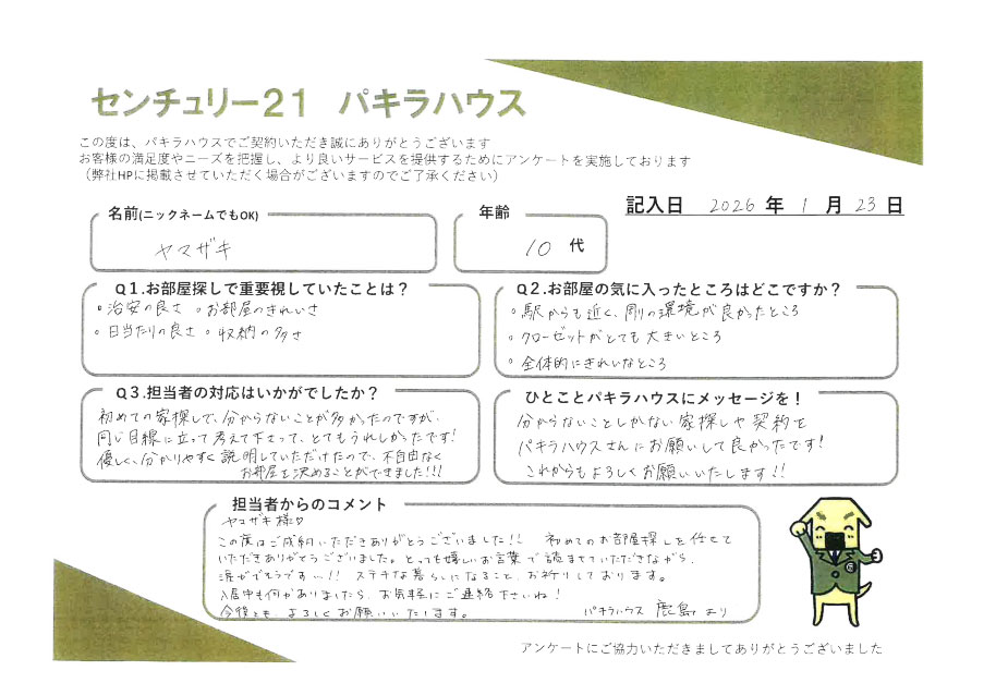 【居住用賃貸ご成約】ヤマザキ様・10代