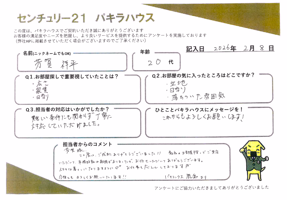 【居住用賃貸ご成約】芳賀祥平様・20代